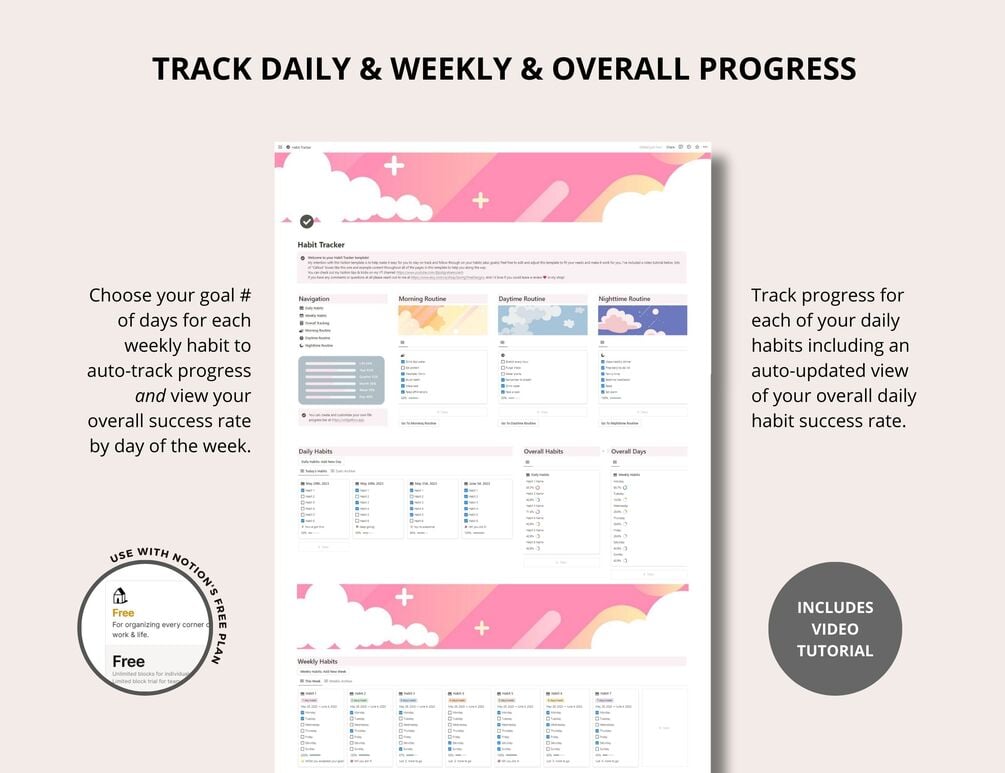 This Notion habit tracker includes daily and weekly habit tracking as well as Notion routine planners and checklists.