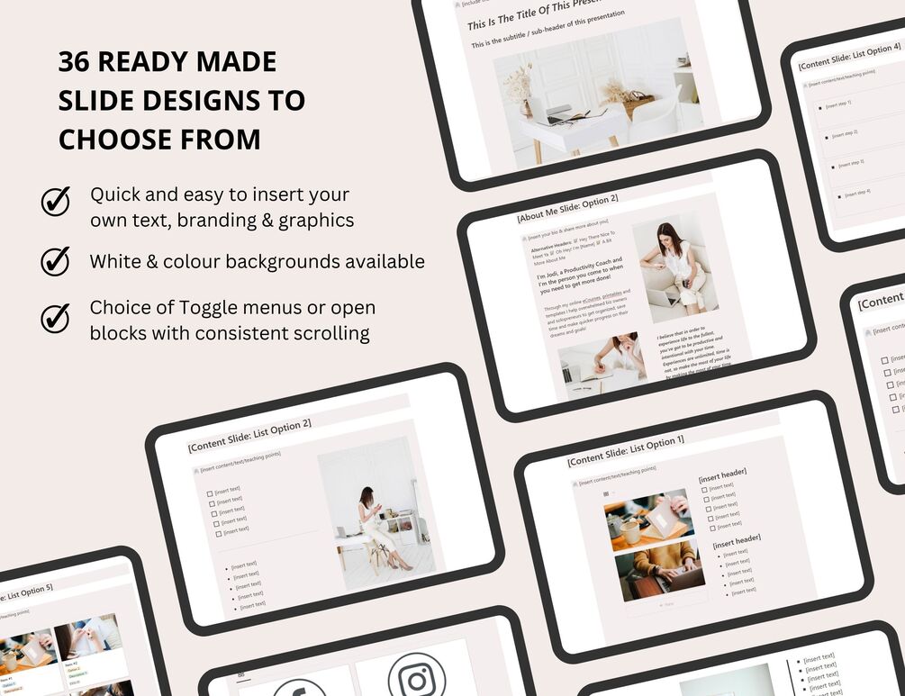 These Notion presentation slide templates for business allow you to quickly create attractive and shareable slides that you can mix and match for your masterclass, workshop, webinar or presentation.