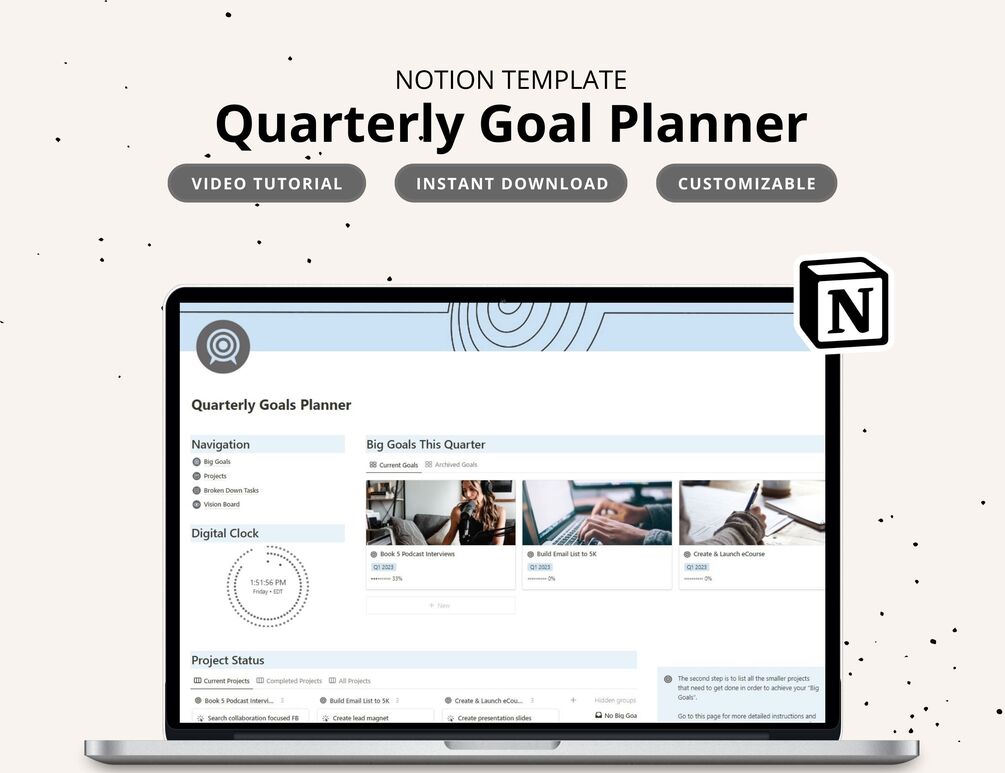 This Quarterly Goal Planner Notion Template makes planning and achieving your goals easy and effortless. Get organized and stay on top of your projects and deadlines as this Notion planner takes you step-by-step through the goal setting process.