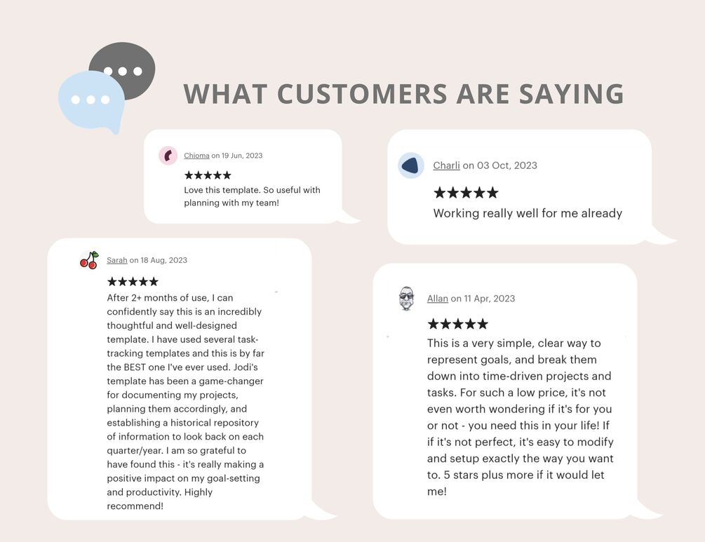 💬 “This is a very simple, clear way to represent goals, and break them down into time-driven projects and tasks. For such a low price, it’s not even worth wondering if it’s for you or not – you need this in your life! If it’s not perfect, it’s easy to modify and setup exactly the way you want to. 5 stars plus more if it would let me!” – Allan