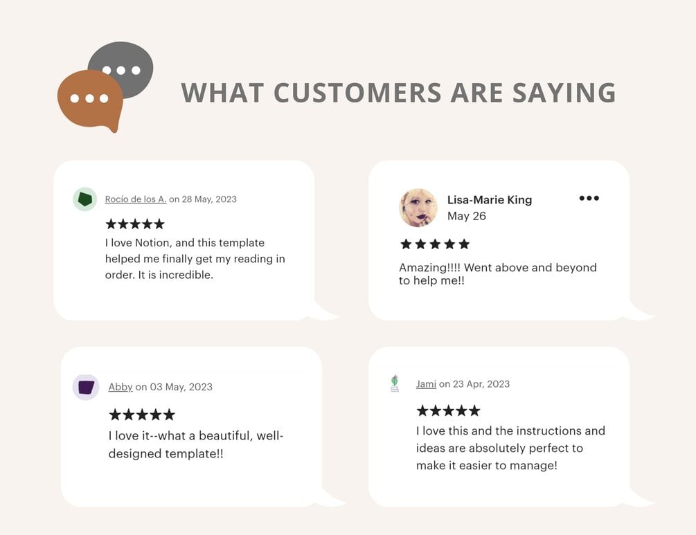 💬 “I love Notion, and this template helped me finally get my reading in order. It is incredible.” – Rocío